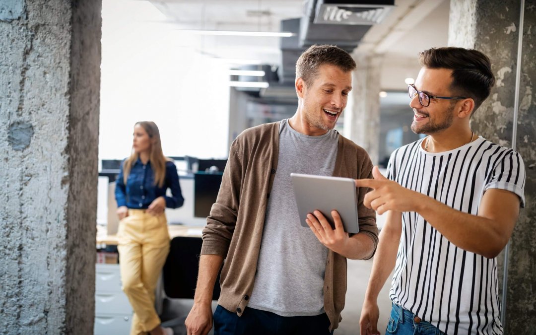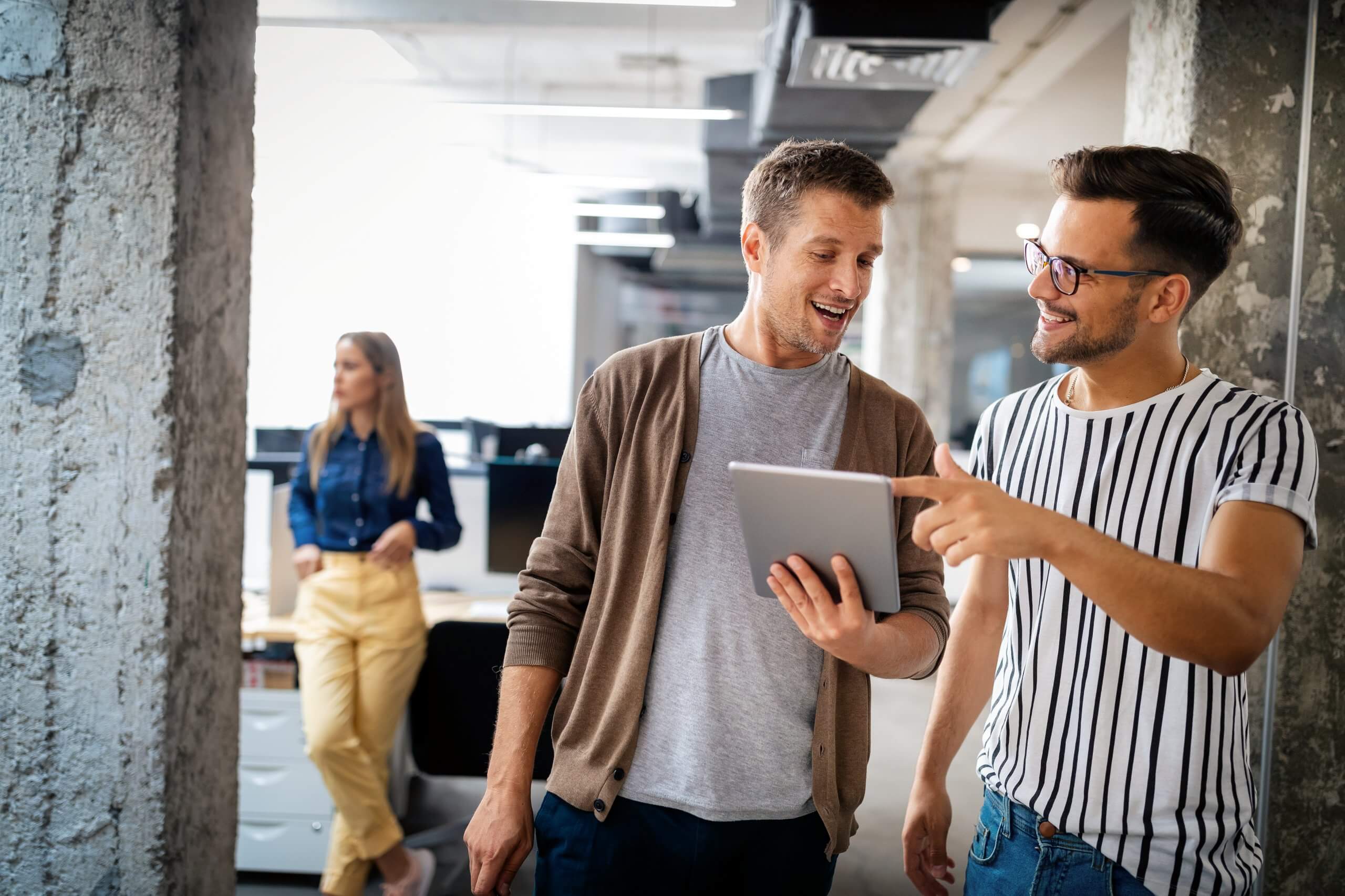 Two men in casual clothes smile and look at a tablet together in a modern office space, highlighting collaboration, while a woman in the background stands near desks and computers.